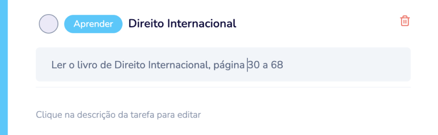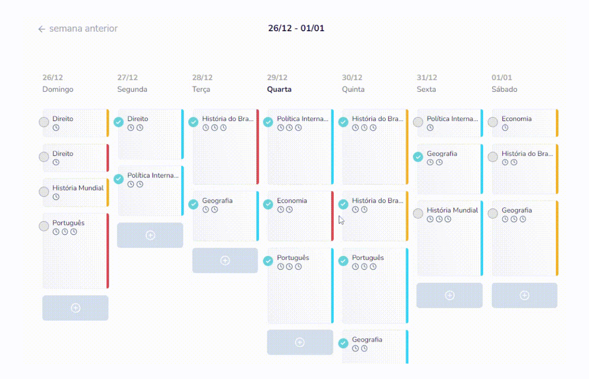 A semana é composta por espaços de slots, que servem para organizar os estudos nos horários do dia: a atividade, o assunto e a descrição do que será feito.